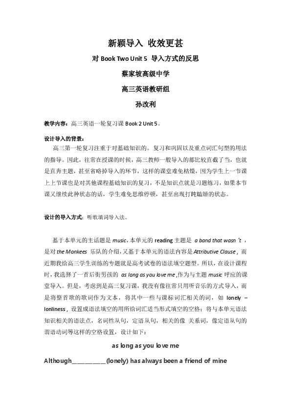 基于本单元的主话题是music,本单元的reading主题是 a band that wasn’t ,是对the Monkees 乐队的介绍,又基于本单元的语法内容是Attributive Clause , 而近期我给高三学生训练的专题就是高考试卷的语法填空题型。所以,在设计课程时,我选择了一首后街男孩的 as long as you love me ,作为与主题music呼应的课堂导入。但是,考虑到是高三复习课,我没有像往常只用听音乐的方式导入,而是将整首歌的歌词作为文本,将其中一些与课标词汇相关的词,如lonely – lonliness , 设置成语法填空的用所给词汇适当形式填空的空格;将与本单元语法知识相关的语法点,名词性从句,定语从句,相关的像 关系词,像定语从句的谓语动词等这样的空格设置,设计如下: