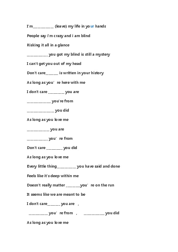 Although_____________(lonely) has always been a friend of mineI'm_____________ (leave) my life in your?handsPeople say i'm crazy and i am blindRisking it all in a glance_____________ you got my blind is still a mysteryI can't get you out of my headDon't care________ is written in your historyAs long as you’re here with meI don't care __________ you are_______________ you're from_________________ you didAs long as you love me______________ you are_____________ you’re fromDon't care __________ you didAs long as you love meEvery little thing____________ you have said and doneFeels like it's deep within meDoesn't really matter _________you’re on the runIt seems like we are meant to beI don't care________ you are ,