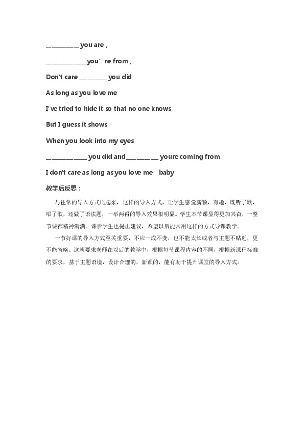与往常的导入方式比起来,这样的导入方式,让学生感觉新颖,有趣,既听了歌,唱了歌,还做了语法题,一举两得的导入效果很明显。学生本节课显得更加兴奋,一整节课都精神满满。课后学生也提出建议,希望以后能常用这样的方式导课教学。