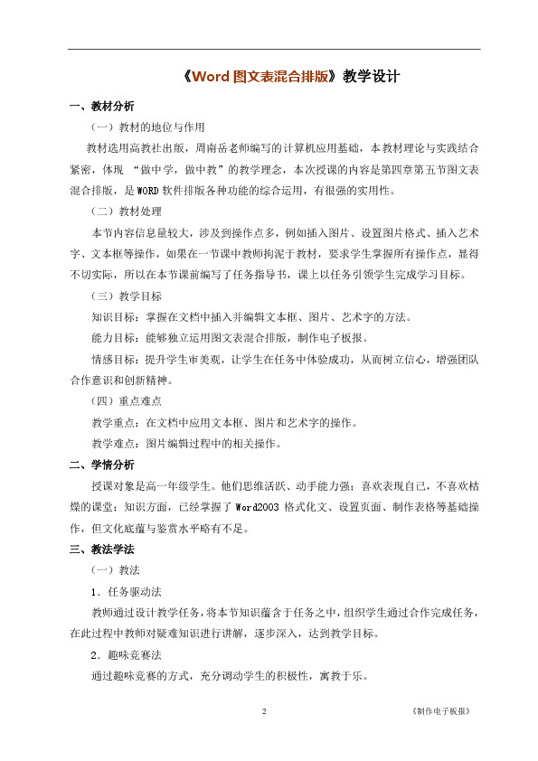 以下为《《Word图文表混合排版——制作电子板报》教学设计》的无排版文字预览,完整格式请下载