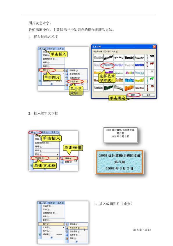 1.插入编辑艺术字和文本框,知识点较为简单,学生通过合作讨论,很快便能掌握操作方法。