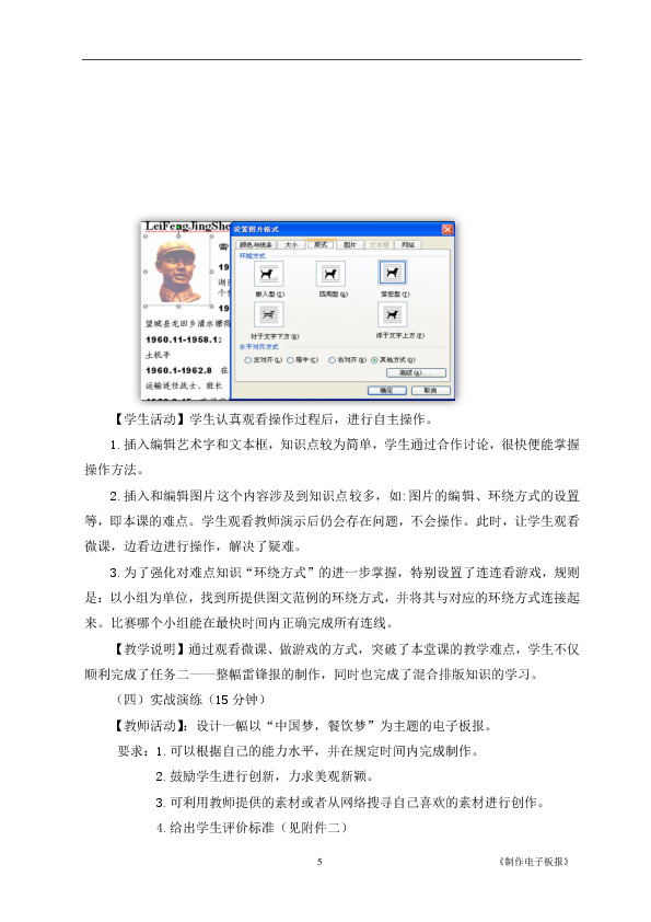 【教学说明】通过观看微课、做游戏的方式,突破了本堂课的教学难点,学生不仅顺利完成了任务二——整幅雷锋报的制作,同时也完成了混合排版知识的学习。