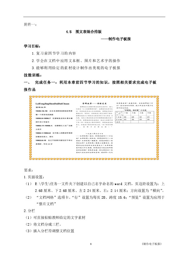 能力目标:能够独立运用图文表混合排版,制作电子板报。