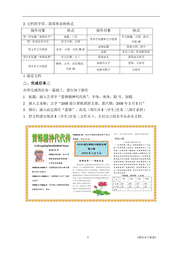 任务一:学生根据任务指导书的要求,通过设置页面、格式化文档、插入表格等操作初步完成雷锋报的制作。