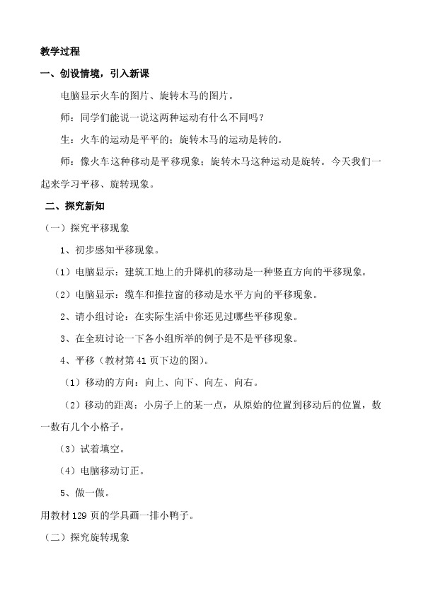 师:像火车这种移动是平移现象;旋转木马这种运动是旋转。今天我们一起来学习平移、旋转现象。