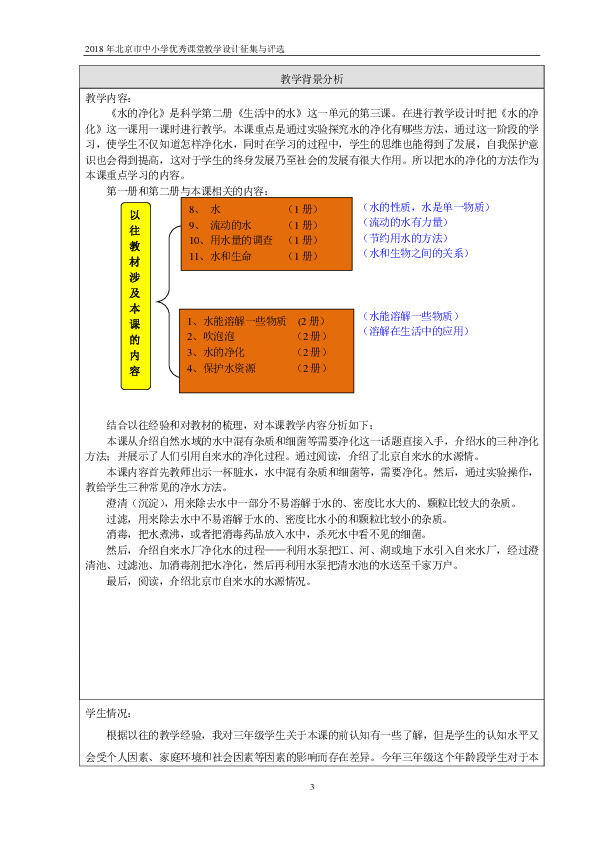 本课从介绍自然水域的水中混有杂质和细菌等需要净化这一话题直接入手,介绍水的三种净化方法;并展示了人们引用自来水的净化过程。通过阅读,介绍了北京自来水的水源情。
