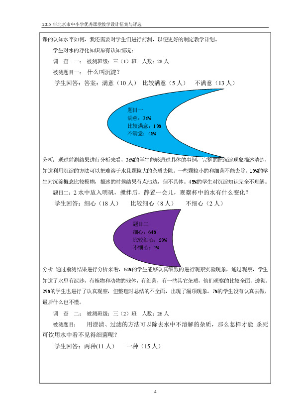 分析;通过前测结果进行分析来看,64%的学生能够认真细致的进行观察实验现象,通过观察,学生知道了水里有泥沙,有植物和动物的残体,有细菌,有一些其它杂质,他们观察的比较全面、透彻。29%的学生也进行了认真观察,但整理时总结的不全面,出现了漏项现象。7%的学生没有认真去做,最后什么也不懂。