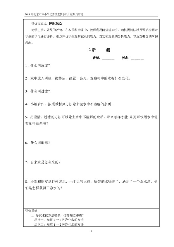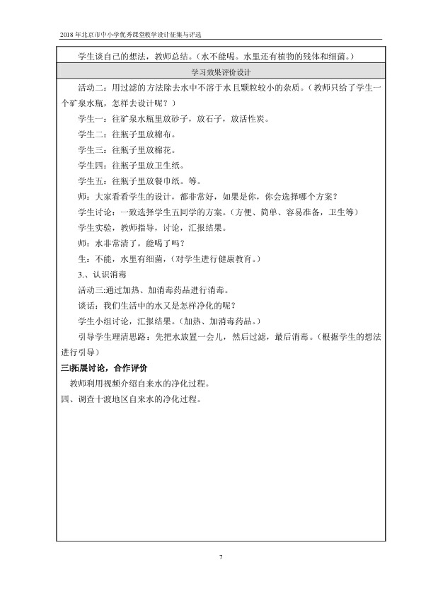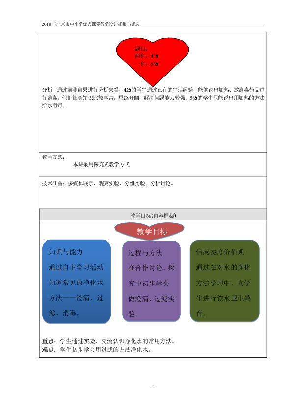 分析:通过前测结果进行分析来看,42%的学生通过已有的生活经验,能够说出加热、放消毒药品进行消毒,他们社会知识比较丰富,思路开阔,解决问题能力较强。58%的学生只能说出用加热的方法给水消毒。
