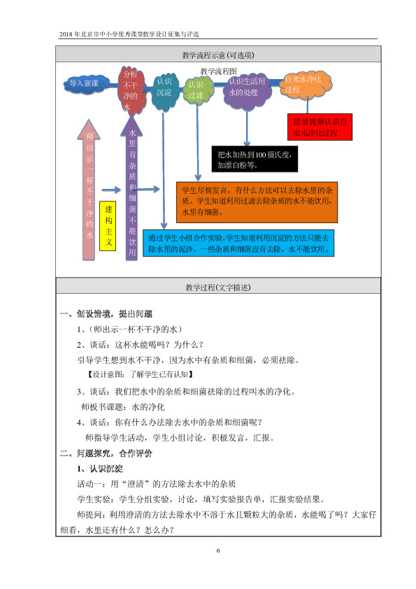 “师出示一杯不干净的水,谈话:这杯水能喝吗?为什么?”(创设情境)——“学生通过实物观察,知道水里有泥沙,有杂质,通过已有生活经验还知道水里有细菌”(探测学生前概念)——“利用原有知识学生认识水净化的方法”(产生新问题)——“观察沉淀,过滤两个实验的现象”(引发认知冲突)——“沉淀和过滤这两个分别能够净化水里的什么物质”(分析解释)——“水净化的方法都有哪些”(建构概念)——“讨论自来水的净化过程”(拓展讨论)。