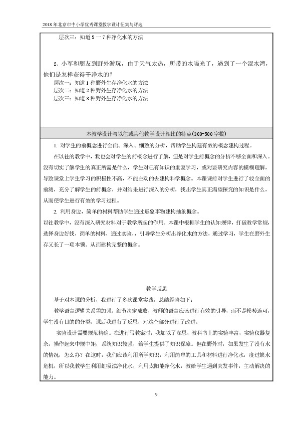 实验设计需要规范精确。在进行写教案时,我加以了深思,教科书上的实验丰富,实验仪器复杂,操作起来中规中矩,系统知识较强,给学生提供了知识保障。但在野外时,如果发生了没有水的情况,怎么办?在这时,我们应该利用所学知识,利用简单的工具和材料进行净化水,度过缺水危机,所以我教学生利用虹吸法净化水,利用太阳能净化水,教给学生遇到突发事件,主动解决的能力。
