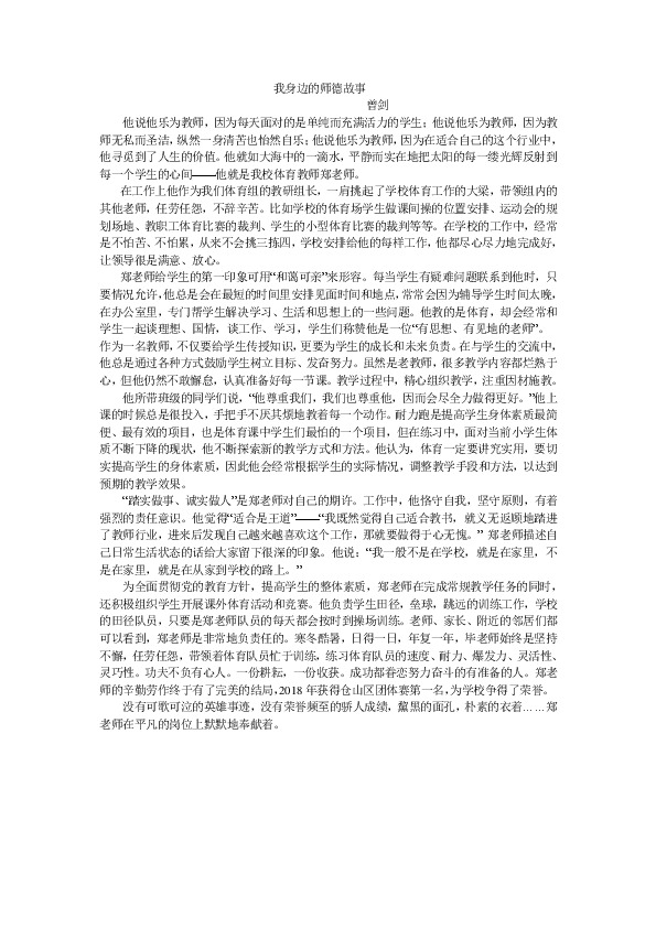 ??? 在工作上他作为我们体育组的教研组长,一肩挑起了学校体育工作的大梁,带领组内的其他老师,任劳任怨,不辞辛苦。比如学校的体育场学生做课间操的位置安排、运动会的规划场地、教职工体育比赛的裁判、学生的小型体育比赛的裁判等等。在学校的工作中,经常是不怕苦、不怕累,从来不会挑三拣四,学校安排给他的每样工作,他都尽心尽力地完成好,让领导很是满意、放心。??? 郑老师给学生的第一印象可用“和蔼可亲”来形容。每当学生有疑难问题联系到他时,只要情况允许,他总是会在最短的时间里安排见面时间和地点,常常会因为辅导学生时间太晚,在办公室里,专门帮学生解决学习、生活和思想上的一些问题。他教的是体育,却会经常和学生一起谈理想、国情,谈工作、学习,学生们称赞他是一位“有思想、有见地的老师”。