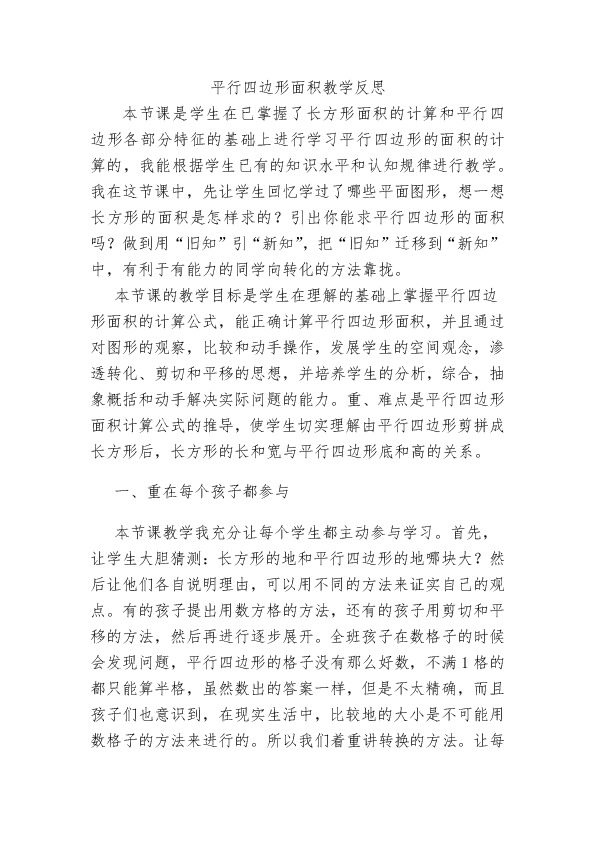 以下为《平行四边形面积教学反思》的无排版文字预览,完整格式请下载