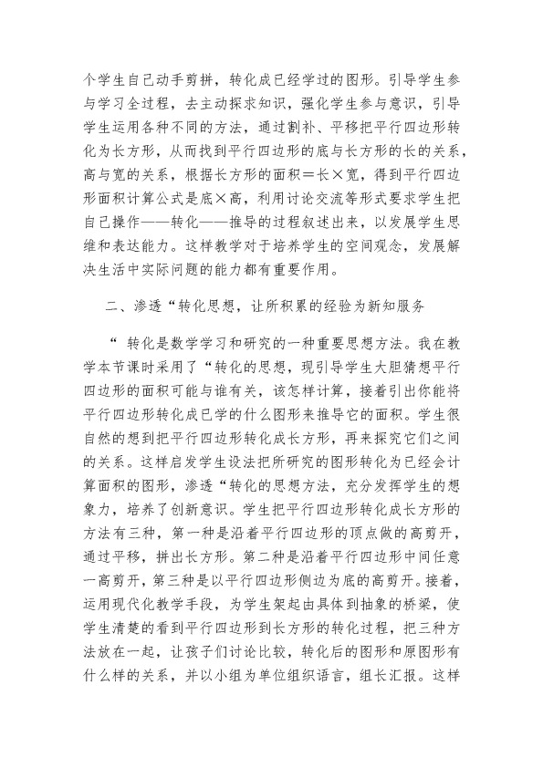 “ 转化是数学学习和研究的一种重要思想方法。我在教学本节课时采用了“转化的思想,现引导学生大胆猜想平行四边形的面积可能与谁有关,该怎样计算,接着引出你能将平行四边形转化成已学的什么图形来推导它的面积。学生很自然的想到把平行四边形转化成长方形,再来探究它们之间的关系。这样启发学生设法把所研究的图形转化为已经会计算面积的图形,渗透“转化的思想方法,充分发挥学生的想象力,培养了创新意识。学生把平行四边形转化成长方形的方法有三种,第一种是沿着平行四边形的顶点做的高某某,通过平移,拼出长方形。第二种是沿着平行四边形中间任意一高某某,第三种是以平行四边形侧边为底的高某某。接着,运用现代化教学手段,为学生架起由具体到抽象的桥梁,使学生清楚的看到平行四边形到长方形的转化过程,把三种方法放在一起,让孩子们讨论比较,转化后的图形和原图形有什么样的关系,并以小组为单位组织语言,组长汇报。这样就突出了重点,化解了难点。通过本节课的学习让孩子们了解到转化的思想很重要,在以后推导三角形、梯形面积的计算公式时可以提供方法迁移。