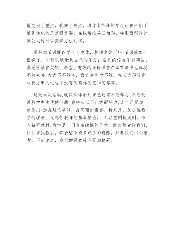 虽然本节课能以学生为主体,教师主导.但一节课就像一面镜子,它可以映射到自己的不足:自己的语言不够简洁、激励性语言欠缺、课堂上有效的评价语言在本节课中也体现不够完善,方式不不够多,语言亲和力不够,在长方形转化成长方形的过程中没有明确标明底和高等等。