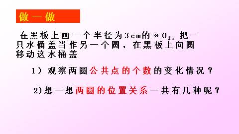 在黑板上画一个半径为3cm的& O1,把一只水桶盖当作另一个圆,在黑板上向圆移动这水桶盖