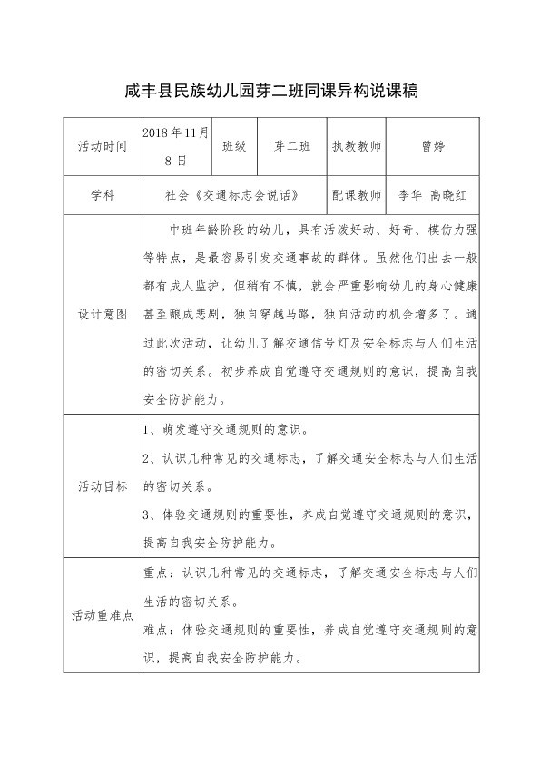3、体验交通规则的重要性,养成自觉遵守交通规则的意识,提高自我安全防护能力。