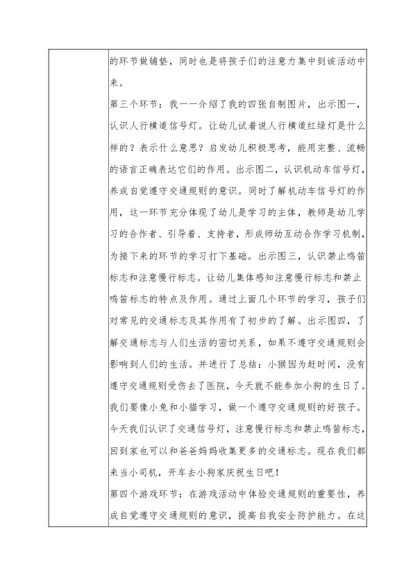 第三个环节:我一一介绍了我的四张自制图片,出示图一,认识人行横道信号灯。让幼儿试着说人行横道红绿灯是什么样的?表示什么意思?启发幼儿积极思考,能用完整、流畅的语言正确表达它们的作用。出示图二,认识机动车信号灯,养成自觉遵守交通规则的意识。同时了解机动车信号灯的作用,这一环节充分体现了幼儿是学习的主体,教师是幼儿学习的合作者、引导着、支持者,形成师幼互动合作学习机制,为接下来的环节的学习打下基础。出示图三,认识禁止鸣笛标志和注意慢行标志。让幼儿集体感知注意慢行标志和禁止