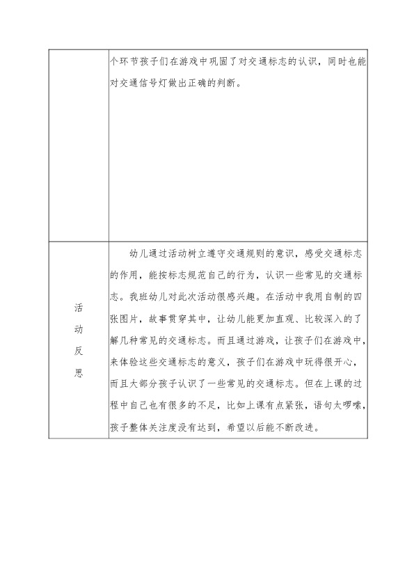 幼儿通过活动树立遵守交通规则的意识,感受交通标志的作用,能按标志规范自己的行为,认识一些常见的交通标志。我班幼儿对此次活动很感兴趣。在活动中我用自制的四张图片,故事贯穿其中,让幼儿能更加直观、比较深入的了解几种常见的交通标志。而且通过游戏,让孩子们在游戏中,来体验这些交通标志的意义,孩子们在游戏中玩得很开心,而且大部分孩子认识了一些常见的交通标志。但在上课的过程中自己也有很多的不足,比如上课有点紧张,语句太Up嗦,孩子整体关注度没有达到,希望以后能不断改进。