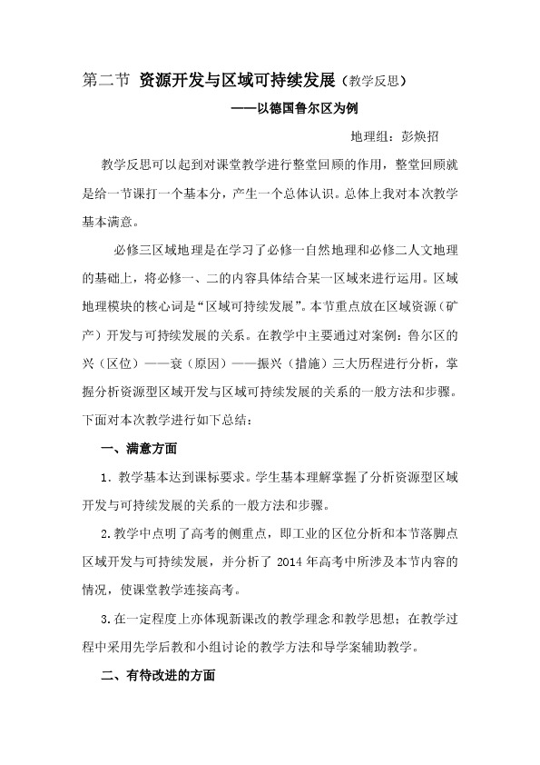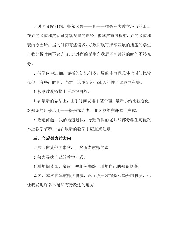1.时间分配问题,鲁某某兴——衰——振兴三大教学环节的重点在兴的区位和实现可持续发展的途径,教学实施过程中,***占据的时间有些偏多,导致实现可持续发展的措施的学生自我分析时间不够充分。此外留给学生自我思考和讨论的时间不够充分。