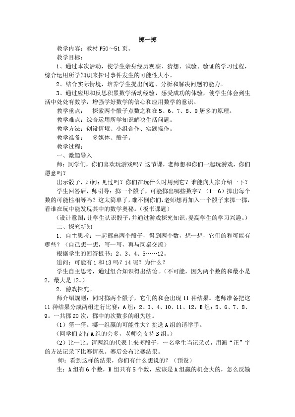 学生回答后,师引导:掷一个骰子,可能掷出哪些数字?(1—6)掷出每个数的可能性相等吗?这太简单了,难不倒你们,老师想再加入一个骰子来掷一掷,看谁在玩中能发现其中的数学奥秘。(板书课题)