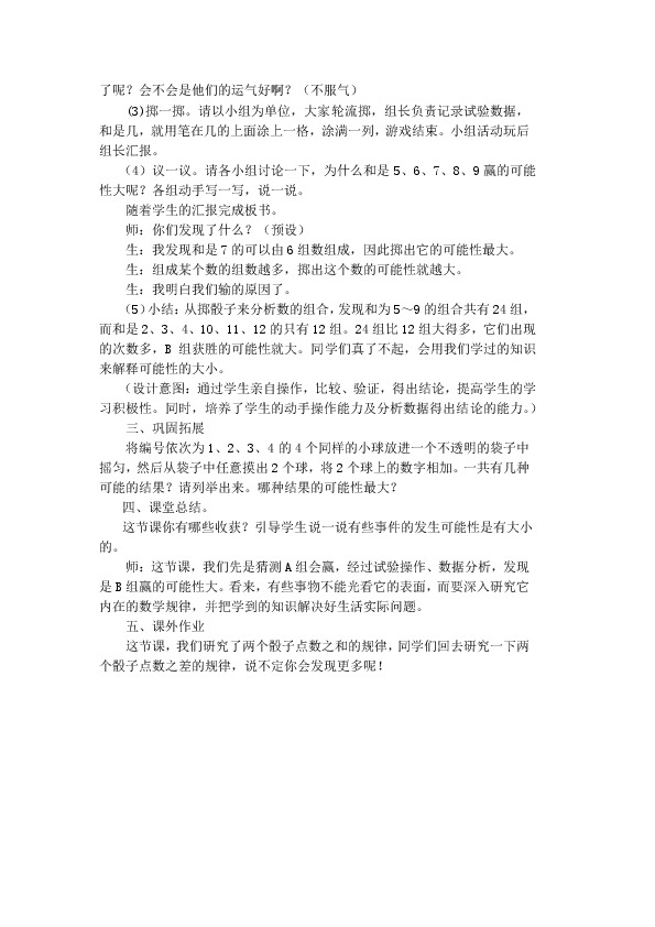 (5)小结:从掷骰子来分析数的组合,发现和为5~9的组合共有24组,而和是2、3、4、10、11、12的只有12组。24组比12组大得多,它们出现的次数多,B组获胜的可能性就大。同学们真了不起,会用我们学过的知识来解释可能性的大小。