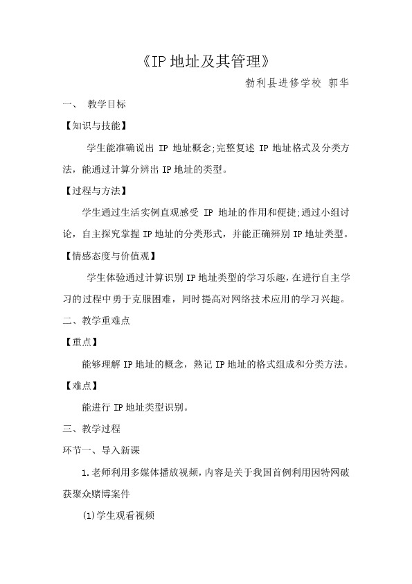 学生体验通过计算识别IP地址类型的学习乐趣,在进行自主学习的过程中勇于克服困难,同时提高对网络技术应用的学习兴趣。 二、教学重难点