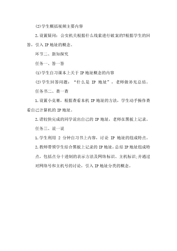 (2)学生回答问题:“什么是IP地址”,老师做补充总结。 任务书二、查一查