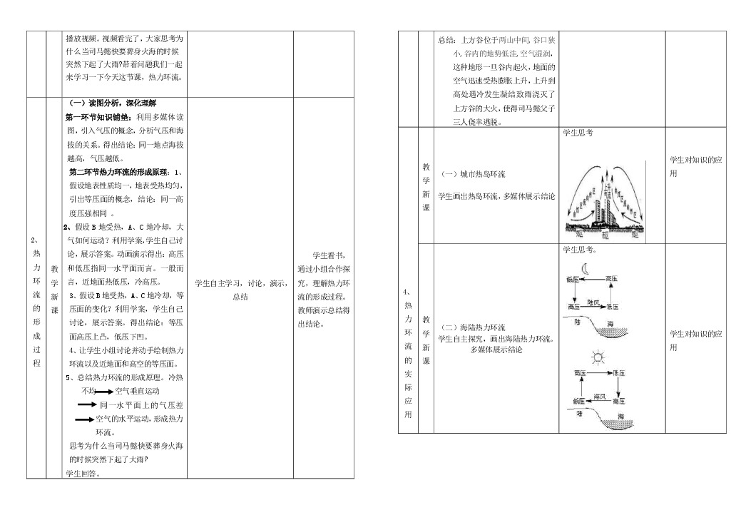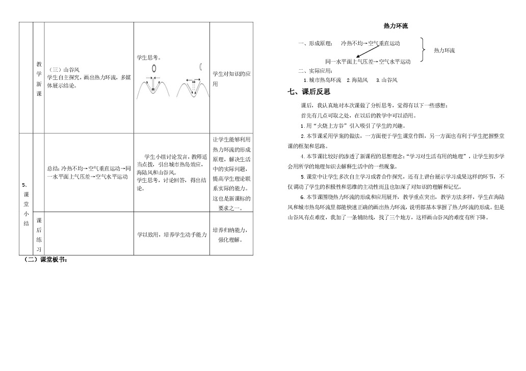 6.本节课围绕热力环流的形成和应用展开,教学重点突出,教学方法多样,学生在海陆风和城市热岛环流里都能快速正确的画出热力环流,说明都基本掌握了热力环流的形成。但是山谷风有点难度,我加了一条辅助线,找了三个地方,这样画山谷风的难度有所下降。