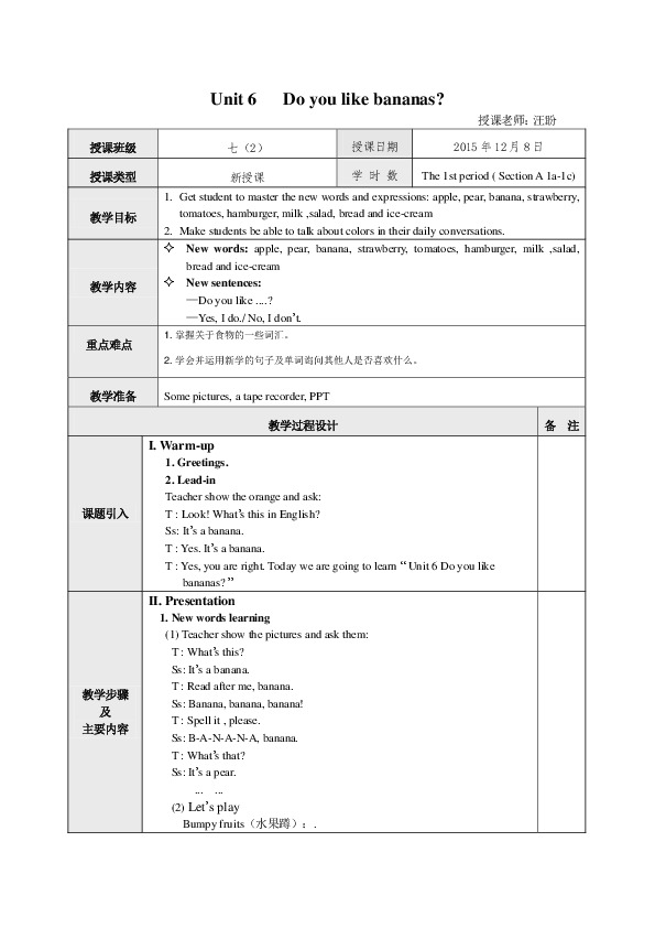 T : Yes, you are right. Today we are going to learn “ Unit 6 Do you like