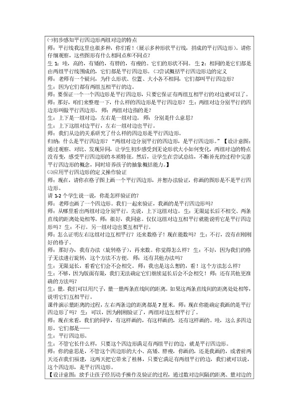 师:从哪里看出两组对边分别平行。先说,上下这组对边。?生:无限延长后不相交、两条直线的距离处处相等。师:很好,我同意。仅仅这组对边互相平行就能说明它是平行四边形吗??生:不行。另一组对边也要互相平行。?