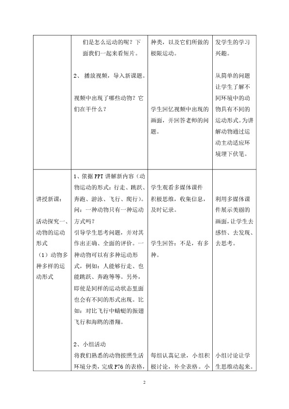 采用多媒体教学资源,利用视频结合自制幻灯片参与教学,更好的体现动物运动的形式多种多样等知识点。