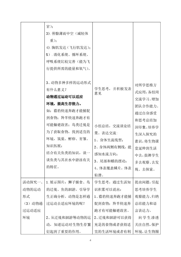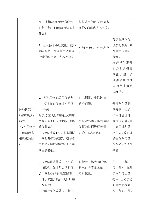 引导学生思考问题,并对其作出正确、全面的评价。一种动物可以有多种运动形式,例如:人能够行走、也能跳跃、奔跑等等。另外,即使是同样的运动状态里面也会有不同的形式出现。比如:对比飞行中蜻蜓的振翅飞行和海鸥的滑翔。