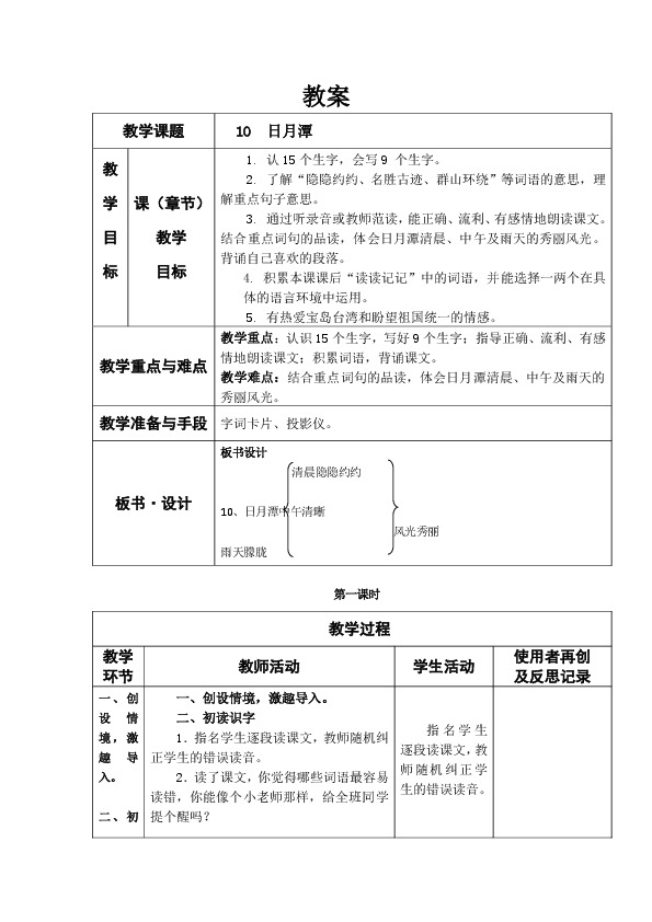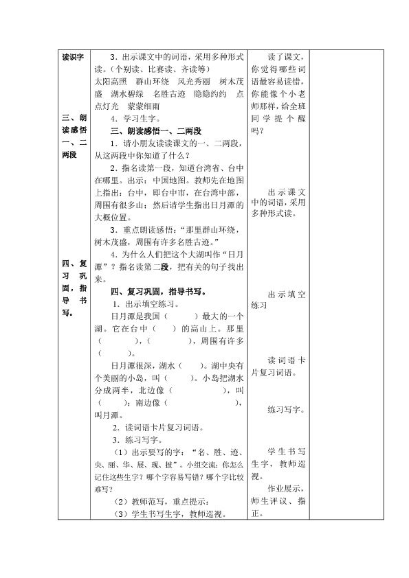教学难点:结合重点词句的品读,体会日月潭清晨、中午及雨天的秀丽风光。