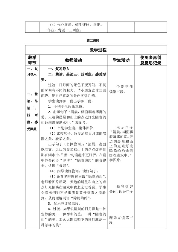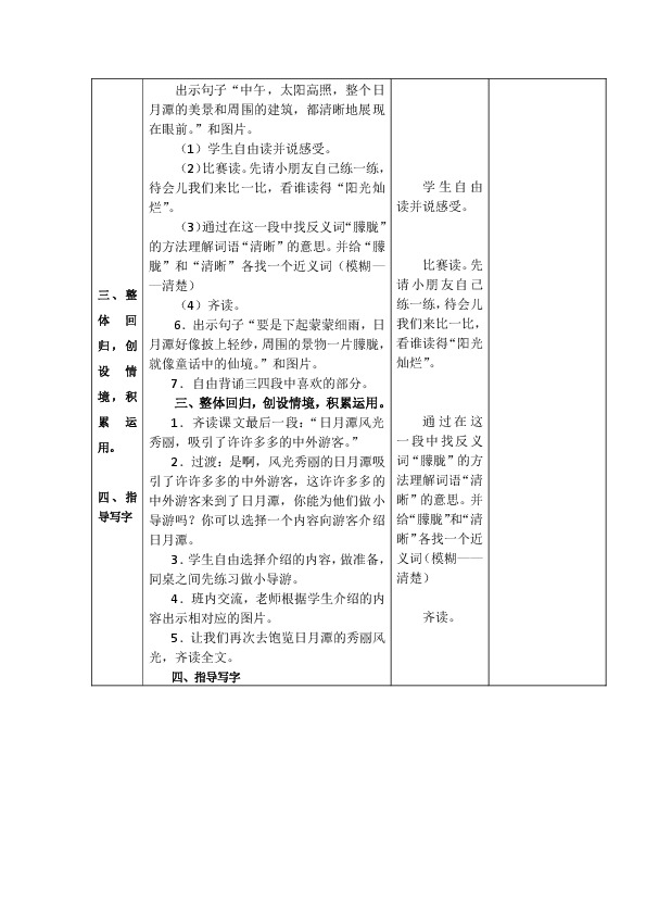 3. 通过听录音或教师范读,能正确、流利、有感情地朗读课文。结合重点词句的品读,体会日月潭清晨、中午及雨天的秀丽风光。背诵自己喜欢的段落。