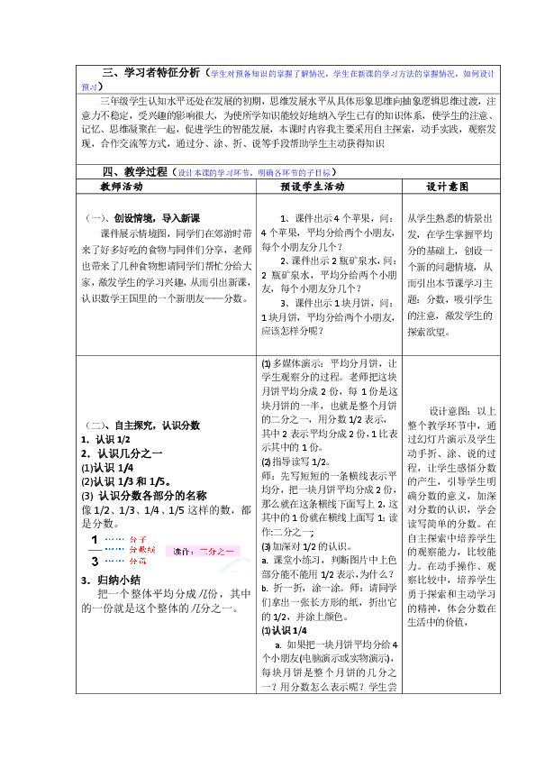 三年级学生认知水平还处在发展的初期,思维发展水平从具体形象思维向抽象逻辑思维过渡,注意力不稳定,受兴趣的影响很大,为使所学知识能较好地纳入学生已有的知识体系,使学生的注意、记忆、思维凝聚在一起,促进学生的智能发展,本课时内容我主要采用自主探索,动手实践,观察发现,合作交流等方式,通过分、涂、折、说等手段帮助学生主动获得知识