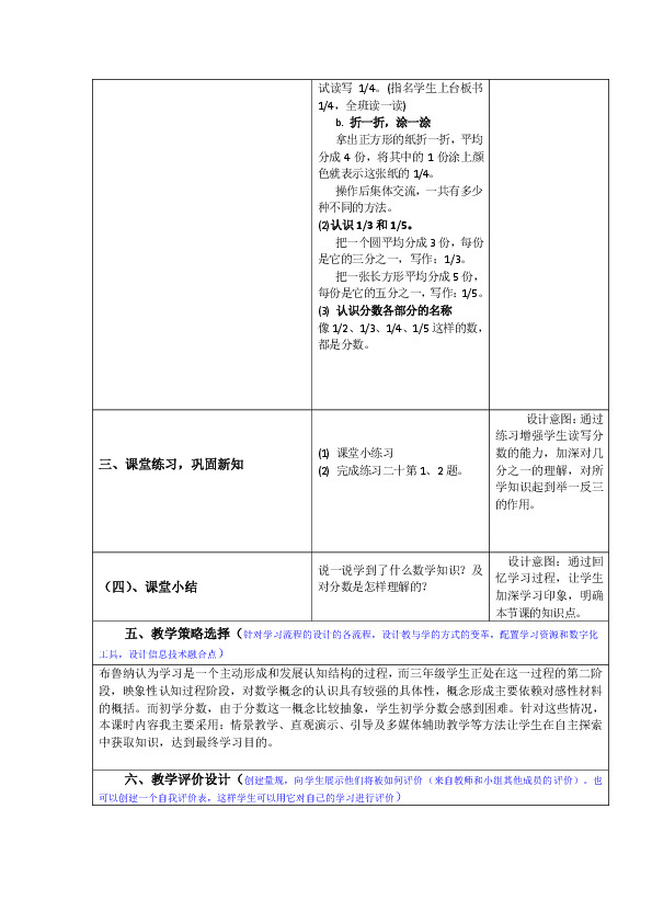 设计意图:以上整个教学环节中,通过幻灯片演示及学生动手折、涂、说的过程,让学生感悟分数的产生,引导学生明确分数的意义,加深对分数的认识,学会读写简单的分数。在自主探索中培养学生的观察能力,比较能力。在动手操作、观察比较中,培养学生勇于探索和主动学习的精神,体会分数在生活中的价值,