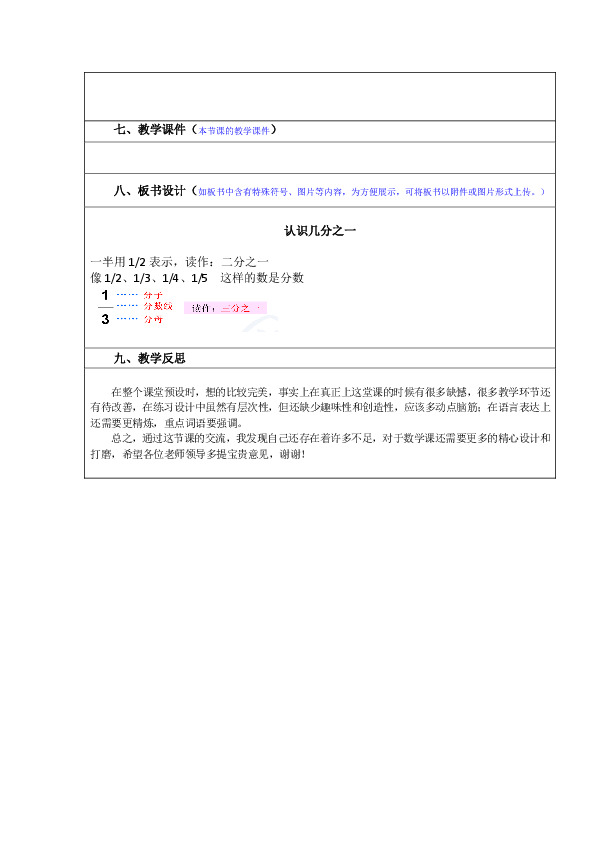 1.初步认识分数,理解几分之一的含义;会读写几分之一,知道分数各部分的名称。