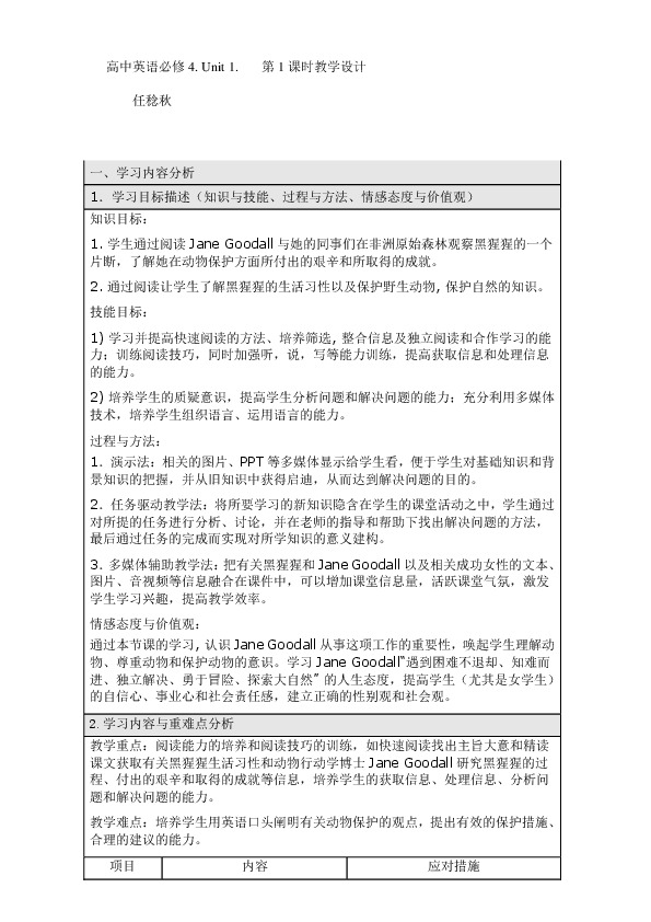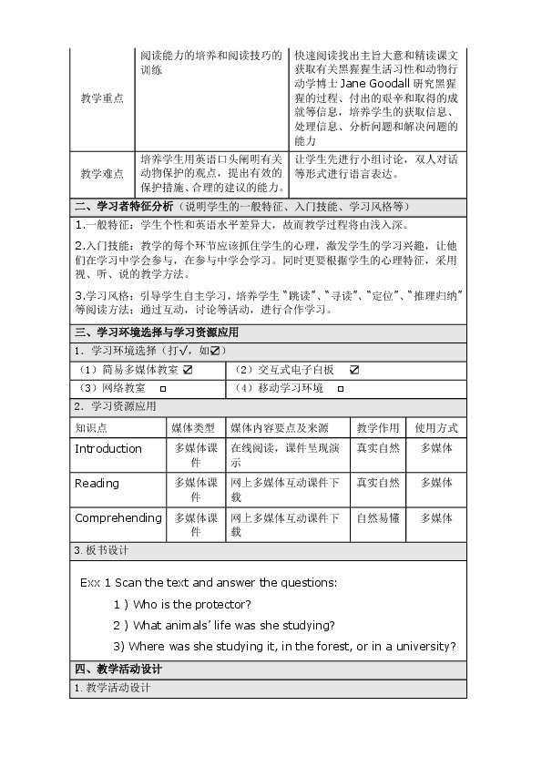 教学重点:阅读能力的培养和阅读技巧的训练,如快速阅读找出主旨大意和精读课文获取有关黑猩猩生活习性和动物行动学博士Jane Goodall研究黑猩猩的过程、付出的艰辛和取得的成就等信息,培养学生的获取信息、处理信息、分析问题和解决问题的能力。