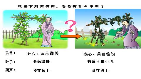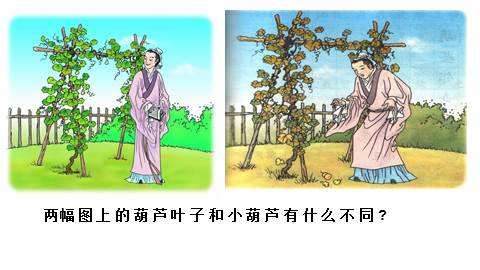 两幅图上的葫芦叶子和小葫芦有什么不同?