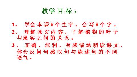 2、 理解课文内容,了解植物的叶子与果实之间的关系。
