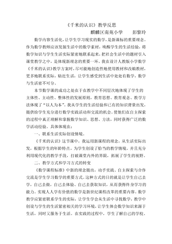 数学内容生活化,让学生学习现实的数学,是新课标的重要理念。作为数学教师应该发掘生活中的数学素材,唤醒学生的生活经验,将数学知识与学生生活实际紧密地联系起来,把社会生活中的题材引入课堂教学之中,是体现新理念的重要一环。我在设计人教版小学数学《千米的认识》教学方案时,尽可能地创造性地使用教材和改编教材,更多地联系实际,贴近生活,让学生感受到生活中处处有数学,数学与生活密不可分。