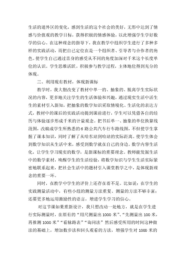 对这节课如果重新设计,我只想改动一处地方,就是在学生进行实际测量时,在原有的“用尺测量出1000米”、“先测量出100米,再推测1000米”“看脉路表”“询问法”然后感受所用的时间这种做法的基础上,增加数步法和回头观看的方法,增强学生对1000米的长度的感受。