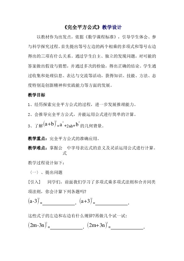 《完全平方公式》教学设计