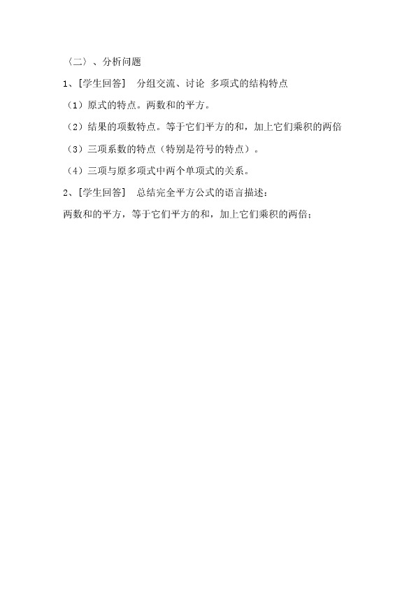 2、[学生回答]?总结完全平方公式的语言描述:
