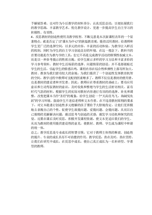 培养了良好的心理品质和健康意识。通过反复练习技术,增强了毅力,勇气,克服了恐惧心理。通过互相交流与帮助,增进了友谊,培养了学生的合作意识和能力。融洽师生关系,同时,通过老师的示范、讲解和保护与帮助,提高师生亲和力、信任感。为学生营造了一个平等和谐、友爱互助的人际环境。?3、反思不到之处,不断走向成熟。再成功的课堂教学,有时也难免出现不足或失误,有些可能还比较严重,甚至有贻误学生之嫌,抑制了学生终身的发展:如一节失败的课或教学中师生间的不愉快冲突;对学生的不当评价;课堂上学生不主动参与、乐于探究、勤于动手;合作学习没有给学生足够的时间和空间,实效性不够;课堂上过分注重知识的传授,仍是“我讲你听”,课堂教学过程被一只无形的手——“教案”所牵制,学生只是一味的接受,而没有关注学生情感、态度、价值观的生成;教学活动的组织形式不利于学生自主探究;问题的提出、情景的创设没有很好地考虑到学生已有的知识和生活经验,没有遵循学生的认知规律;备了教材,但忽视了备学生;重“复制”却忽视了“创意”;忠实地执行着既定的程序,却忽视了课堂中的动态因素,学生的学习兴趣没有很好地激发调动起来;教师跟在学生后面走或教师牵着学生走XXXXXXXXXX课后,对以上问题回顾、整理并通过与其他教师交流研讨来反思自己的教学行为,使自己清醒地意识到潜藏在教学行为背后的教学理念,提出一些扬长避短的改进措施,使之成为自己今后教学时应吸取、借鉴的教训,从而不断强化有效教学的意识,提高教学水平,提高课堂教学效率。4、反思学生的行为,优化教学设计。基础教育课程改革再一次重申:教育的根本目的是为了每一位学生的发展,课堂教学也不例外。课堂上学生精彩的作答、独特的解法、创新的思维,课后我们总喜欢与同事交流,分享课堂上那份欣喜。教学中,学生“创新的火花”一旦迸溅,我们教师应及时或延时予以充分的肯定,这无疑是对学生的激励和赞赏,这样,不仅使学生的好方法、好见解、好思路得以推广和拓宽,同时,也是对课堂难能可贵的补充及完善。对学生课堂上出乎意料及个性化的见解;学生在课堂师生互动、同伴合作中的行为表现、参与热情、情感体验和探究、思考的过程等等,教师要善于捕捉和及时反思,充分关注学生的差异,尊重不同学生在知识、能力、兴趣等方面的需要,适当加以调控。及时记下学生的疑问,由此进行判断和分析,找到学生产生问题的根源,然后按不同的原因、不同的学生用不同的方法给予解疑答难。也可作为今后教学的材料养分,认真反思总结,以便拓展我们的教学思路,丰富教学艺术,优化教学设计,更进一步提高学生自主学习的积极性、有效性。4、反思教材的创造性使用及教学机智。不断完善是本次新课程改革的一个显著特点,就是否定了以“课本为中心”的狭隘教育观,提倡活用教材,给教师和学生更广泛的选择空间,以多元的内容,丰富的活动体验,为教学注入鲜活的机制,同时为学生的自主学习创造良好的环境。在这一理念下,教科书的首要功能是作为教与学的工具,但它不再是完成教学活动的纲领性权威文本,而是以一种参考提示的性质出现,给学生展示多样的学习方法和丰富多彩的学习参考资料。教材中生活场景的选择、问题情景的创设,并不是都很贴近学生的生活,引起学生的情感共鸣。课程内容在综合性和弹性上都有所加大,教材、教参为我们留有较大的余地,为我们提供了一个创造性发挥教育机智的空间,教学过程中教师可支配的因素增多了,教师不仅仅是教材的使用者,也是教材的建设者和开发者。因此,教师应在尊重教材的基础上,要有应用意识和主动驾驭教材的意识,及时收集和整理与学生的生活密切相关、富有时代气息的材料,根据学生的实际对教材内容进行有目的的选择、补充和调整,改变把课本当作“圣经”的现象,给学生创设一个“天高任鸟飞,海阔凭鱼跃”的学习环境,鼓励学生不迷信老师和文本作者,在不违背教材原则的要求下,对文本能进行创造性多元理解的孩子要给予大胆地肯定,让他们更积极地去表现自己的个性。促使学生敢提问题、爱提问题、会提问题,从而以自己独特的见解解决问题,激活思考与创造的灵感,激发学习动机和探究的欲望。还要在课后及时反思,积极开发课程资源,使文本更适应我们的学生。从而为教材的使用提供建设性的意见,使教材、教师、学生成为课程中和谐的统一体。总之,教学反思是专业成长的智慧引领,它对于教师主体性的释放、创造性的提升、专业的成长具有不可估量的作用。教学反思,贵在及时,贵在坚持。让我们在研究中成长,在反思中成长,使自己真正成长为一名科研型、学者型的教师。