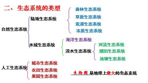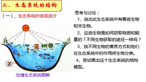 型二、生态系统的类型自然生态系统森林生态系统草原生态系统农田生态系统人工生态系统海洋生态系统淡水生态系统河流生态系统湖泊生态系统池塘生态系统城市生态系统荒漠生态系统冻原生态系统陆地生态系统水域生态系统果园生态系统 ________是地球上最大的生态系统生物圈池塘生态系统图解(一)、生态系统的组成成分 思考与讨论: