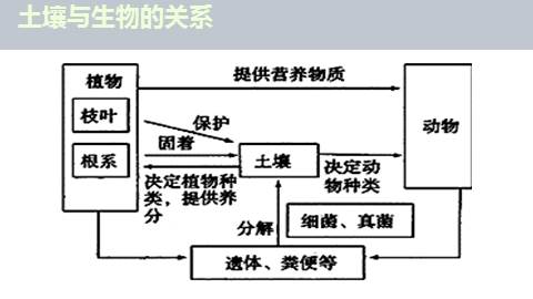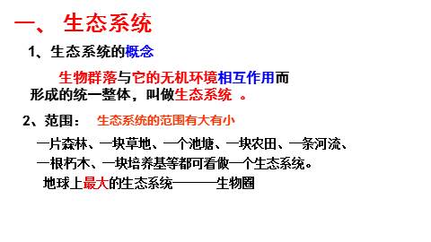 动物粪便和动植物遗体残骸,经过细菌、真菌的分解而变为土壤中的腐殖质,使土壤更肥沃,为植物根系的发育提供了各种营养物质。 土壤与生物的关系 一、 生态系统2、范围:1、生态系统的概念 生物群落与它的无机环境相互作用而形成的统一整体,叫做生态系统 。生态系统的范围有大有小一片森林、一块草地、一个池塘、一块农田、一条河流、一根朽木、一块培养基等都可看做一个生态系统。
