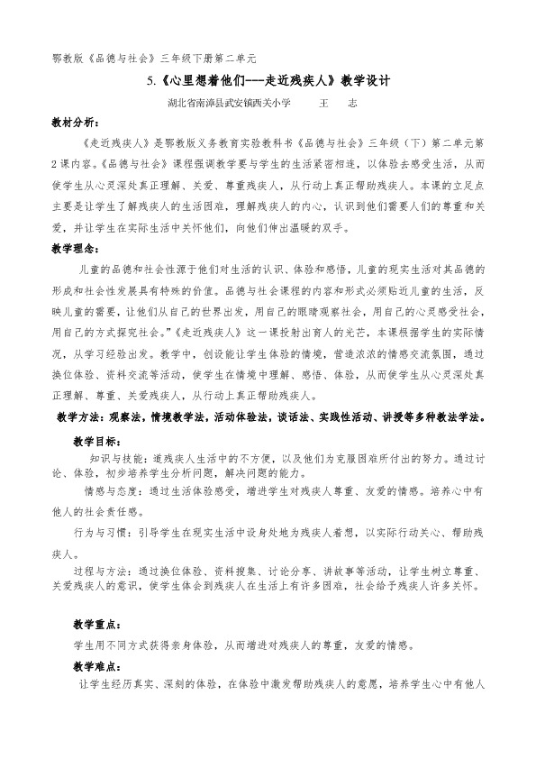《走近残疾人》是鄂教版义务教育实验教科书《品德与社会》三年级(下)第二单元第2课内容。《品德与社会》课程强调教学要与学生的生活紧密相连,以体验去感受生活,从而使学生从心灵深处真正理解、关爱、尊重残疾人,从行动上真正帮助残疾人。本课的立足点主要是让学生了解残疾人的生活困难,理解残疾人的内心,认识到他们需要人们的尊重和关爱,并让学生在实际生活中关怀他们,向他们伸出温暖的双手。