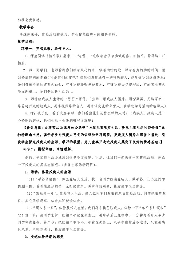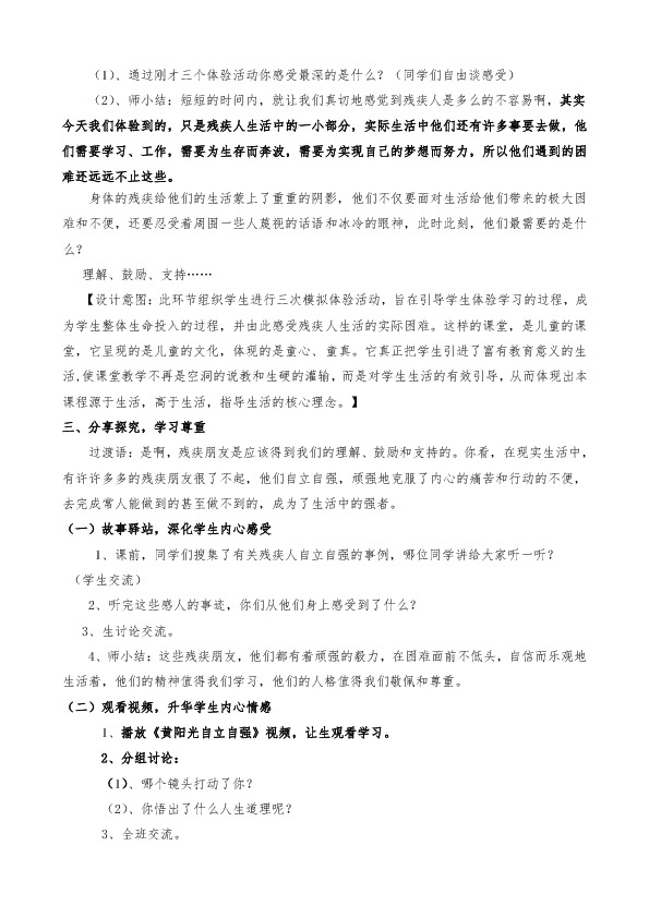 过程与方法:通过换位体验、资料搜集、讨论分享、讲故事等活动,让学生树立尊重、关爱残疾人的意识,使学生体会到残疾人在生活上有许多困难,社会给予残疾人许多关怀。