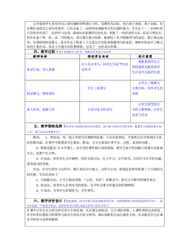 教法: 1、朗读法:每一篇文章都有其独特的意蕴,只有反复朗读,才能领会其中深刻而丰富的思想内涵,在教学中我要求学生散读、默读,让学生感悟作者平实、自然、柔美的风格。 2、情境设置法:在本节课上,充分利用课件展示创设情境,使学生很自然的融入到课文的意境中去,思想产生共鸣。 3、讨论法:培养学生合作精神,利用小组讨论,自主学习、合作探究,共同分享合作的乐趣,感受成功的喜悦。 学法:在学生的学习 内容过长,仅展示头部和尾部部分文字预览,全文请查看图片预览。 希望同学们也能学习作者热爱读书、奋发向上的精神。今天的课上到这里,下课!